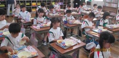 非常災害時、おいしいご飯を食べられることを知り、感動した子どもたちです。