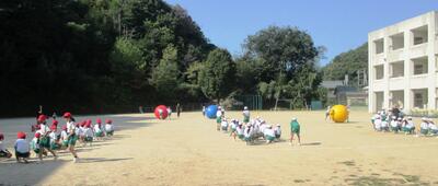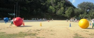5年生は、体育大会の学年種目で取り組む「大玉転がし」の練習。