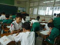 1年生は漢字の学習が進んでいます。書き順や字の意味を確かめながら、丁寧に書いています。2年生は、4チーム対抗のリレーをしていました。バトンつなぎに気をつけながら、応援する声も元気いっぱいでした。図書委員会の読書月間企画に協力しようと、3年生は図書室で読書を楽しんでいました。4年生は、書写指導員の講師の方をお迎えして、「大地」という字を練習していました。筆の動かし方やはね、はらいの書き方など、分かりやすく教えてもらいました。5年生は、リコーダーで「威風堂々」を演奏していました。壮大なメロディを表現できるように、息の強さや指穴を正確に押さえることを意識しながら練習していました。6年生は、持続可能な社会を生きるために、自分たちにできることを話し合っていました。フードロスの削減や節電・節水など、日常で実践しやすいアイデアを出し合っていました。