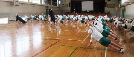 6年生の合同体育。音楽に乗りながらの身体表現。