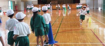4年生の2クラスが、合同体育で折り返し障害リレー。