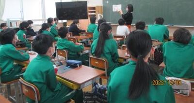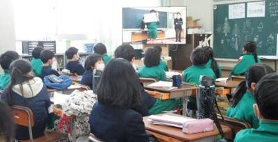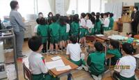 敦賀警察署の方による「ひまわり教室」で話を聞く6年生。