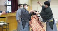 〇〇先生が装束体験をしました。少しずつ仕上がる様子に会場がざわめき、