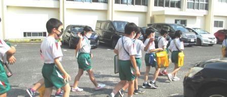 6年生が、さわやかな朝のひざしをあび、校外学習に出かけました。