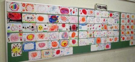 1年生掲示板には、100人分の「おひさまニコニコ」が並んでいます。