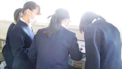 6年生数名が、廊下の一角でタブレットにむかって会話していました。