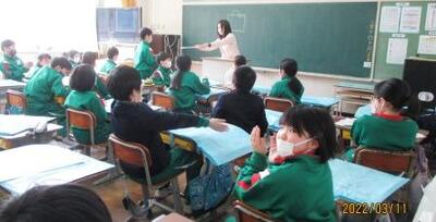 これは、この3月で学校を去られる先生のお話を聞く子どもたちの様子です。