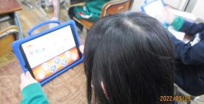 2年生は、タブレットで1年間の復習をしていました。
