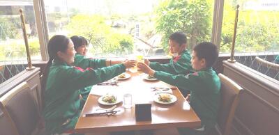 お待ちかねの昼食タイム。笑顔で「かんぱ~い!」