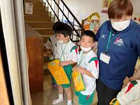 お土産で買った「カワウソちゃん」と子どもたちの笑顔がはじけます。
