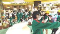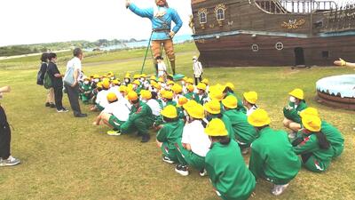 芝政に到着。ガリバーの前で自由行動についての話を聞く子どもたち。