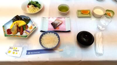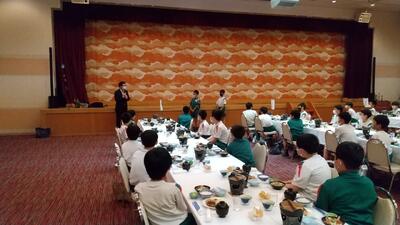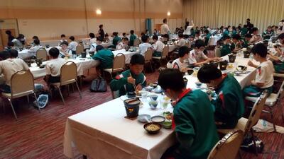 大広間にて、代表児童がお宿の方にご挨拶をした後、夕食です。