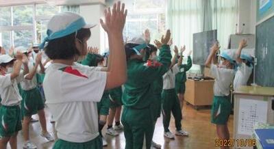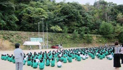 全校児童が一堂に集うのは春の避難訓練以来。校歌や大樹も高らかに響きました。
