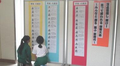 児童玄関掲示板には、体育大会テーマと各色の応援リーダーの