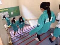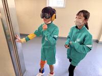 高齢者体験教室では、膝を曲がりにくくするサポーターや視界を狭めるゴーグルなどをつけて高齢者役をした友達の階段昇降などをサポートする体験をしました。