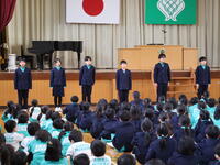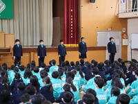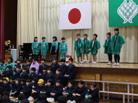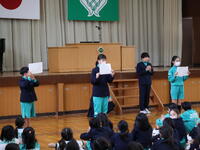 児童総会が開かれ、新児童会役員の承認、旧児童会役員のあいさつ、ハイタッチあいさつ運動の表彰が行われました。