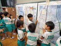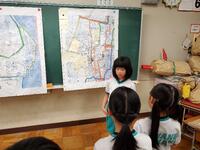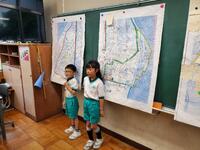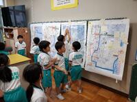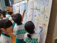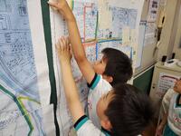 2年生が、生活科「町たんけん」の学習で、グループにわかれて地域の紹介を付せんに書き、地図に貼りました。