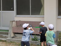 身の周りの容器を使って、どうやれば水をたくさん貯めることができるのか、どうすると遠くまで水を飛ばせるのか等々、活動の中で水や空気の性質を体感していました。