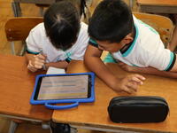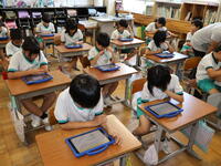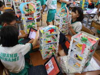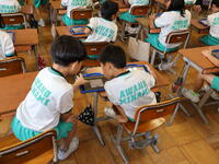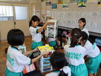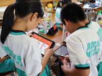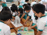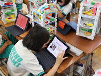 夏休みを前に、図画工作の作品が完成し、互いの作品を鑑賞したり、自身の作品の振り返りをタブレットに入力したりしました。