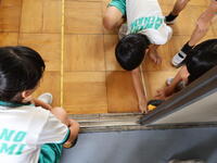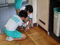 また、教室の同じような場所を計測していても長さに違いがあることから、床の板目に沿って、最短距離の直線で計測することに気付く班もありました。