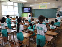 はじめの校歌斉唱では、全校の各教室から元気よく明るい歌声が響きました。