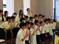 次に、茨城県水戸市との姉妹都市親善友好少年交歓研修の激励会を行い、参加する児童が抱負をスピーチしました。