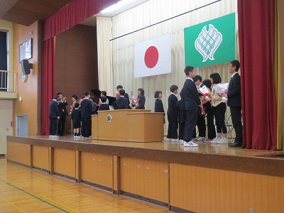 卒業式練習の時間を一部使って、6年間一度も休まなかった児童への皆勤賞やその他のコンクール、校内で行われた国語・算数コンテストの満点賞、おそうじ大賞の表彰が行われました。おそうじ大賞の表彰では環境委員から表彰が手渡され、1年を通して掃除を頑張った児童にはトリプル賞も贈呈されました。