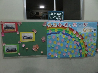 6年生からのラストメッセージが、6年生の学年掲示板に掲示されています。一人ひとりが在校生や先生に向けたメッセージを風船に書いて残してくれました。卒業式が終わって次の学年に向けてステップアップする1~5年生の背中を押してくれています。