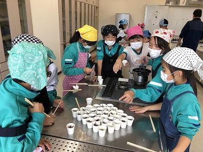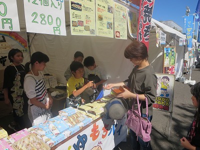 10月3日(水) 国体売店ブース「はぴねすマルシェ」で、芋粥もちパイの販売を行いました。参加した5,6年生の児童たちがチラシを配ったり、商品を渡したりするなど活躍しました。用意した412個を完売しました。