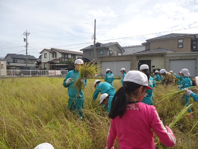 9月13日(木) 9時から「田んぼの学校」稲刈りに参加しました。雑草をかき分けながら、たくさんのお米を収穫することができました。この体験を通じて、米作りの大変さや農家の方の苦労などに気づき、食に対する感謝の思いを持つことができました。