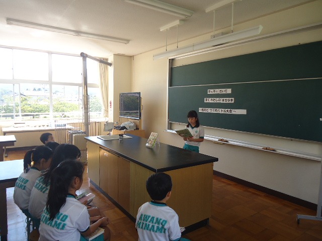 9月19日(水) 昼休みに理科室で行いました。「ねえ、ねえ。きいて!ぼくのわたしのすきな本」ということで、6人の児童が参加しました。しっかりと本を読み込み、自分の言葉で本を紹介しました。「読書の秋」思わず読んでみたくなる説明でした。