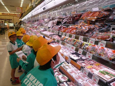 10月10日(水) 3年生がスーパーマーケットを見学させていただきました。売り場の工夫や売り場から見えないところで働いている方の仕事の様子も教えていただきました。バロー敦賀店の皆様、ていねいに対応していただきありがとうございました。