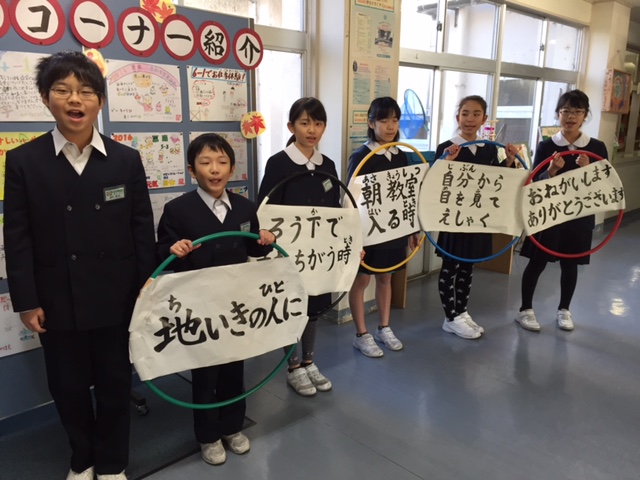 | 概要 | 11月18日(金)からあいさつオリンピック第2弾がはじまりました。児童会運営委員のメンバーが登校時間に玄関で呼びかけを行っています。自分から進んであいさつや会釈ができるよう心がけるといいですね。 |