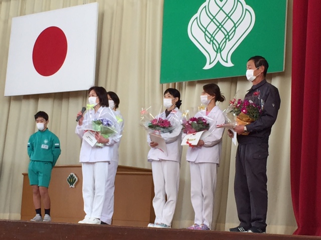 | 概要 | 1月26日(木)業間に給食委員会が計画した給食感謝の集会が行われました。前半に全校アンケートの結果をもとにしたクイズがあり、後半に用務員の山内さんと、今年度から粟野南小にお勤めしている調理員さんにサイネリアの鉢をプレゼントしました。私たちのために働いてくださりありがとうございます。私たちも給食をなるべく残さずいただきます。 |