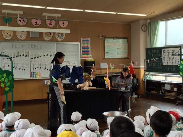 | 概要 | 5月9日(月)の昼休み、音楽室で読み聞かせの会を行いました。人形や舞台装置を使って「せんたくかあちゃん」のお話を読みました。222人の子どもたちが参加しました。 |