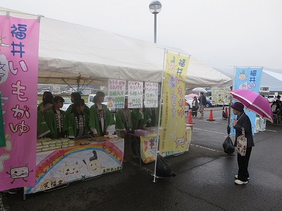 | 11月4日(日) 粟野公民館で行われた「秋まつり」で芋粥持ちパイの販売第4弾を行いました。経験を積み成長した6年生児童は、雨に負けず張りのある元気な声で、用意した374個を見事完売しました。 |