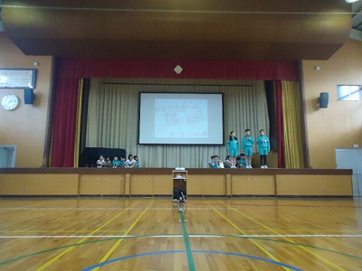 | 11月14日(水) 今日は昼休みに、ふれあいまつりの各学年PRのリハーサルを行いました。今年度からPR時間を短くし、より分かりやすく発表内容を伝えることになりました。各学年代表児童は緊張気味でしたが、ステージ上で当日のように元気に声を出していました。更に練習し、レベルアップしたPRが見られそうです。 |