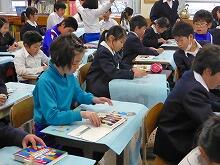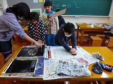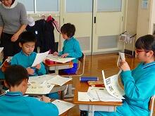 | 学習が進むにつれて、空いている部分が明らかになっていくのでしょう。 | 6年生は、賢治に関する資料読み合わせながら、しきりに線を引いています。何か気になることがあるのでしょうね。 |