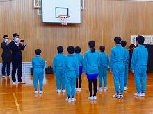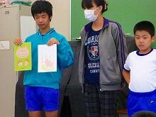 | あと少しで学校が見えてきます。がんばれ!! 3・4年の部の1、2位争いです。 | 表彰式です。 5・6年の部では、あと6秒で新記録でした。風の影響もあり更新はできませんでしたが、よく力を出し切りました。 | 閉会宣言です。 しっかり締めて、マラソン大会を閉じました。 |