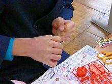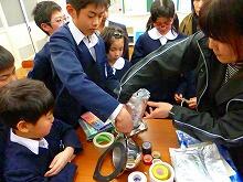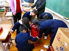 | 容器の大きさを見ながら、どれを入れようか迷っています。でも、将来の自分にあてた手紙は大切だから、それは入れましょう!! | 二つに折るといいかな? ん~。大丈夫だと思うけど‥ いろいろやり取りしながら、作業は進みます。 | アルミのふくろに脱酸素剤を入れて、高温のアイロンで密着させます。5・6年生は家庭科でアイロン実習もしましたから、お手のものです。たのもしい!! | できたものをステンレス容器に入れていきます。子どもたちだけではちょっと大変なので、先生もお手伝いです。 | 何とかうまく入りました。 これからは、周りのボルトを締めていきます。3・4年生もできるので、手伝いました。 | |||||||||