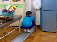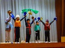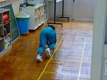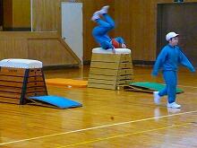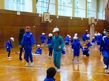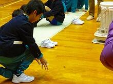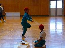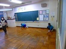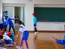 | さて、まずはお約束の準備運動です。足首や筋肉を傷めないよう、よくほぐしましょう。 | 大縄の最初は、軽く飛ぶことから、順調にみんなクリアしていきます。 | このジャンプだと縄に引っかからないですね。 | 次は、いつもの勝ち抜きじゃんけん。勝ったら跳び続けてたいへんだけれど、負けたら抜けてまたすぐ入らなくてはならないから、どっちもいい運動になりますね | お次は、足でのじゃんけん。手前の子が勝ちました。運動量もぐんと上がってきます。子どもたちの身体も心もヒートアップ | ||||