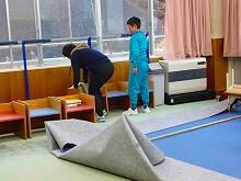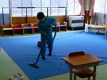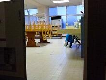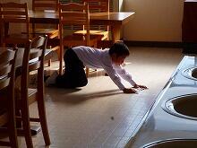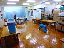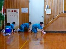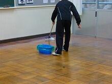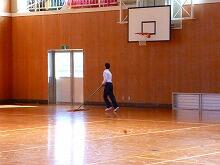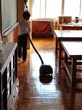 | 図工室です。工作机の足に掃除機のコードが絡まることも。 | 教職員も含めて全員が給食を食べるランチルーム。一人ではちょっと疲れてきたかな? | 体育館のモップかけ。軽やかにジョギングしながら隅々まできれいに。 | 教室です。先生(写っていませんが)と二人で、一心不乱にがんばってます。 | |||||||||||||||