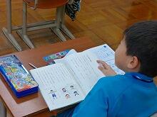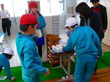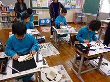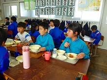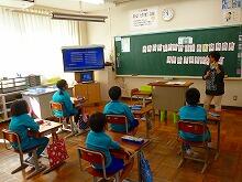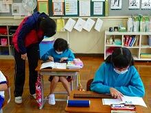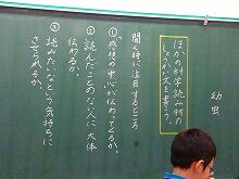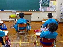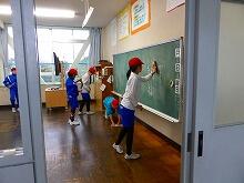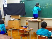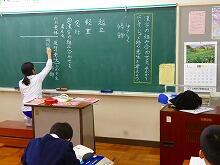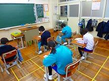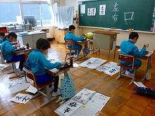 | 5年生には、仕上げで「空いた所をすべて書いて」とお願いしてしましました。 これは、来週火曜日の休校式で使います。 | 給食準備も少人数になりましたが、分ける数も減っているし大丈夫か? | 国語の授業風景。 新出漢字の意味や書き順の勉強です。 授業もあと少しで終わりになります。 | お待ちかね、昼休みです。 バドミントンブーム再来!! 体いっぱい使って楽しんでいます。 |