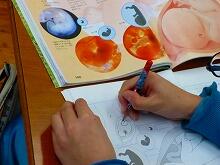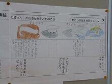 | 赤ちゃんが育つまでの様子です。これはよく見る図ですね。子どもたちも知っているかもしれません。 | 家族がどんなことを話してくれたのか、人のことながら、みんな興味深々です。 | 時々先生からの質問もとびます。迷うことも‥‥。 | 家族がその時感じたこと読みながら、改めて自分への思いの深さに気づいたようです。 | |||