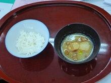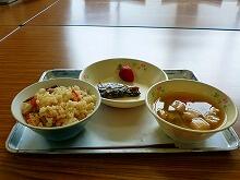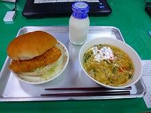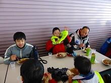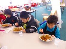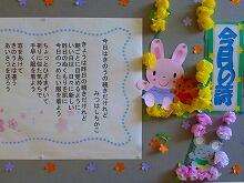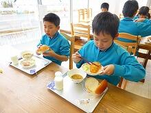 | いつもは拭かないのですが、黒板も絞った雑巾できれいに拭きあげました。 | 最後の給食です。 今日のメニューは、ハンバーグ、スープ、デコポン、それにご飯、牛乳です。 調理員さん、いつもおいしい給食をありがとうございました。 | 外は、晴れてい天気ですが、風は冷たいです。 ランチルームから見る風景は、春の訪れを感じさせる色に変っています。 | 池の鯉たちにもえさをあげましょう。 温かくなってきたからか、食欲旺盛でした。 |
