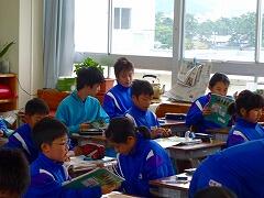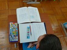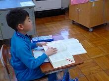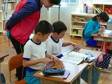 | 4年生の国語です。漢字の直し、練習中です。 | 分からなかった漢字は、辞書を引きながら調べていました。 | 3年の国語では、修飾語の勉強中でした。主語と述語の間に、いろんな修飾語が、それも一つずつ増えていきました。 | ||||||||||