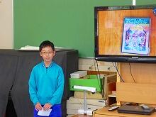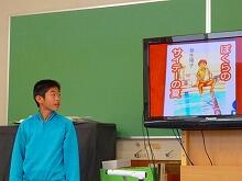 | 紹介された本は全部で3つのシリーズに分かれていて、15冊ほど出ているとのことでした。 まだすべては読んでいないとのこと。 これからも楽しい読書が続きそうです。 | 題名にひかれて読んだということですが、内容は奥深く、自分も主人公のように知らない人と仲良りたいと思わせる本とのことでした。 | 学校の図書コーナーにある全部で30冊余りのシリーズの本の紹介でした。下級生や先生方からいろんな質問も出ましたが、分かりやすく答えてくれました。 |