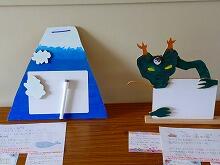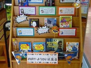 | 1階のオープンスペースにある図書コーナーです。 手に取りやすく、見たくなるような工夫がいっぱいされています。図書支援員さんが、がんばってくれています。 | こんなにたくさんあったんだと思うくらい、「お化け・妖怪」の本が集めてありました。キャッチコピーを読むと、つい本を手に取ってしまいます。 |