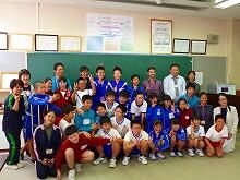 | ミニパーティーで食べてます。隣の女性は、ALTの先生です。 | これは「ヤングココナツジュース」です。うす甘く、不思議な味でした。 | 4校合わせて、これだけのみんなが参加して交流を深めました。 |