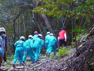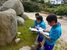 | 埋められるのを待つタイムカプセル。以前先輩たちが使ったものの再利用です | 前回は、立石灯台の中においてありましたが、今回は土の中です。厚手のビニールで何重にもくるんで少しでも水分が入らないようにしました。乾燥剤もたっぷり入っています。 | 深い穴です。先に行った3・4年生も興味深げに見ています。掘るのは大変だったでしょうね。 | そこに穴があれば入ってみたくなるのは子どもです。ちょっと入ってみましたが、地面から出るのは頭だけみたいです。 | 運んで来てくれました。落とさないようにゆくりと慎重に! | ||||||||||||